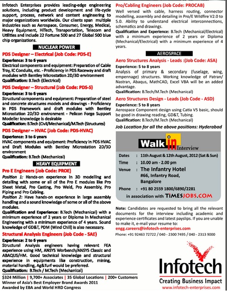 Infotech Walkin interview in Bangalore on August 11th 12th 2012 for Experienced